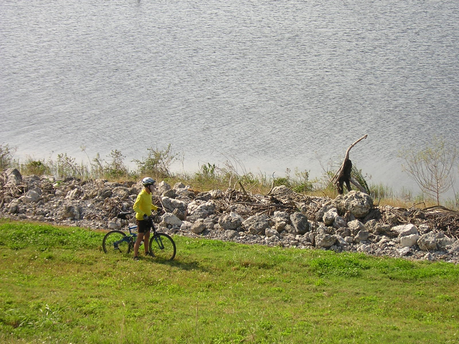 We flew along the pavement at great speed, but all good things must end. This rocky section on the west side of the lake let the air out of everyone's tires. Good news is: Soft tires absorb the bumpyness of the rocks. | ![]() |